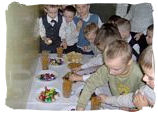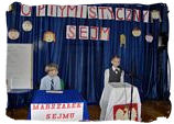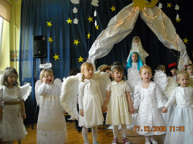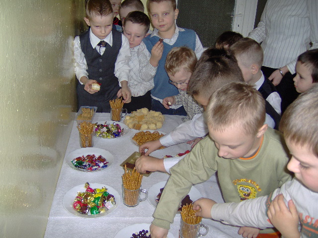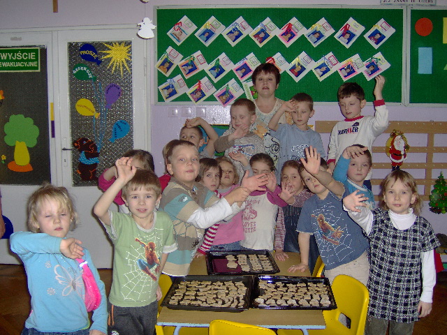 14-15.01.2009 - DZIEŃ BABCI I DZIADKA Jak co roku dzieci z każdej grupy zaprosiły Babcie i Dziadków do przedszkola. Były wierszyki, piosenki i tańce, a babcie i dziadkowie na pewno szczęśliwi i wzruszeni, bo wnuki były rewelacyjne. Dobrze, że jest taki dzień. Wnuczki namalują piękne laurki, złożą piękne życzenia i obdarują babcie przygotowanymi prezentami. ZABAWY NA ŚNIEGU Piękna zimowa aura sprzyja dziecięcym zabawom na śniegu. Dzieci zjeżdżały z górki na sankach, lepiły bałwana, bawiły się śnieżkami, budowały śnieżne budowle. Figlom i harcom na świeżym powietrzu nie było końca. 18.12.2008 - JASEŁKA Jasełka to przedstawienie z wieloletnią tradycją. W wykonaniu przedszkolaków nabierają szczególnego wdzięku. Wszystkie dzieci w dniach 17-18 grudnia 2008 wystąpiły dla wszystkich rodziców i pracowników przedszkola, zarówno maluchy jak i starszaki udowodniły, że nie są im obce bożonarodzeniowe zwyczaje. Malutkie gwiazdeczki, pastuszkowie, trzej królowie i aniołki nic nie straciły ze swojego majestatu i zachwyciły widownię pięknym wykonaniem kolęd i pastorałek. Były życzenia i wspólne kolędowanie. IDĄ ŚWIĘTA Święta Bożego Narodzenia to najbardziej uroczyste święta w naszej tradycji. Święta na które wszyscy czekamy z utęsknieniem, do których przygotowujemy się długo i starannie. Od 1 grudnia nasze przedszkolaki wielkimi krokami przygotowywały się do Świąt Bożego Narodzenia. Uczyły się wierszy, kolęd i pastorałek. Przygotowywały bożonarodzeniowe przedstawienie dla rodziców. Najwięcej pracy włożyły dzieci w pieczenie i ozdabianie pierniczków oraz krojenie i suszenie owoców. Każda choinka w naszym przedszkolu jest inna. Jedna ubrana w pierniczki, druga w suszone owoce, trzecia w kwiaty ze zdjęciami dzieci a czwarta w ozdoby z papieru wykonane przez dzieci. Przedszkolaki wykonały kartki świąteczne, które z życzeniami powędrowały w świat. MIKOŁAJKOWA NOC W PRZEDSZKOLU W nocy z 4.12.2008 na 5.12.2008 przedszkolaki z dwóch najstarszych grup oczekiwały wyjątkowego gościa. Wieczorem ze swoimi śpiworami i materacami stawili się w przedszkolu. Frekwencja dopisała. Wspólne kolacje, ubieranie choinki, mycie zębów, krótki bal piżamowy i już można było przygotować się na spotkanie z mikołajem. Obudził dzieci dzwoneczkiem i wszystkim rozdał prezenty. Była to niezwykła noc. Nikt nie płakał za mamą i nikt nie bał się spać w przedszkolu. Było to spotkanie z prawdziwym Świętym Mikołajem. Nasz gość pozostał z dziećmi jeszcze przez cały dzień. Witał przybywające do przedszkola przedszkolaki i częstował słodkościami. Potem był bal mikołajowy. Prezentów nie zabrakło dla nikogo. Mikołaj obiecał, że wróci do nas za rok. 28.11.2008 - UCZNIOWIE SZKOŁY PODSTAWOWEJ NR4 W STRZEGOMIU W NASZYM PRZEDSZKOLU Dnia 28.11.2008r. w ramach współpracy ze Szkołą Podstawową nr 4 w Strzegomiu odwiedzili nas uczniowie kl I z wychowawczynią Panią Barbarą Niespodziańską. Uczniowie czytali i recytowali przedszkolakom wiersze Jana Brzechwy. Nasze dzieci zaprezentowały się w programie artystycznym o tematyce jesiennej. Były wspólne zabawy, tańce oraz słodki poczęstunek. 27.11.2008 - ANDRZEJKOWE WRÓŻBY Jak co roku w naszym przedszkolu odbywają się "Andrzejki". Był to radosny dzień zabaw i wróżb. Było lanie wosku, przekładanie butów, losowanie kubków przyszłości, wróżenie z kart. W każdej grupie rodzice przygotowali słodki poczęstunek. Dzieci poznały tradycje ludowe i wróżby andrzejkowe przekazywane od wielu pokoleń. 25.11.2008 - DZIEŃ PLUSZOWEGO MISIA W tym dniu zaprosiliśmy do naszego przedszkola misie naszych przedszkolaków. Każde dziecko przyniosło swojego ukochanego misia. Dzieci poznały historię pojawienia się pierwszej pluszowej zabawki w kształcie misia. Wzięły udział w konkursie "Kochamy pluszowego misia". Za udział w konkursie otrzymały pamiątkowe dyplomy. Całe przedszkole zamieniło się w "misiową krainę". Dzieci wykonały piękną wystawę swoich misiów, które codziennie rano witają dzieci. Był to prawdziwie "misiowy dzień". 20.11.2008 - Nagroda dla Antosia Tulińskiego Dnia 20 listopada w SCK w Strzegomiu odbyło się uroczyste wręczenie nagród laureatom konkursu plastycznego "Bezpieczna droga do szkoły". Antoś Tuliński odebrał nagrodę za zdobycie III miejsca. Praca została wykonana pod opieką Pani Moniki Kurek. Zwycięzcy otrzymali dyplomy oraz drobne upominki. Gratulujemy zwycięzcom. 29.10.2008 - PASOWANIE NA STARSZAKA 29 października był wyjątkowym dniem dla naszych przedszkolaków. W tym dniu odbyła się uroczystość pasowania na starszaków. Przedszkolaki z wielkim przejęciem opowiedziały w wierszach o trudnym życiu starszaka, o wielu obowiązkach i powinnościach. Część słowna przeplatana była popisami tanecznymi i piosenkami o jesieni. Jednak najważniejszym punktem uroczystości było pasowanie na starszaka. Po złożeniu ślubowania dyrektor przedszkola Wiesława Górka pasowała każde z dzieci dużą zieloną kredką. Na pamiątkę tej wyjątkowej chwili maluchy otrzymały dyplomy oraz rożki ze słodyczami. Dzieciom kibicowali tego dnia rodzice, którzy nie kryli dumy ze swoich pociech. Gratulacje przedszkolakom złożył również burmistrz Strzegomia Lech Markiewicz, który życzył, aby każda chwila w przedszkolu była radosna i dobrze wykorzystana. 23.10.2008 - "JEDZIE POCIĄG Z DALEKA" W dniu 23.10.2008 odwiedził nasze przedszkole były pracownik Polskich Kolei w Jaworzynie Śląskiej. Dzieci wyruszyły w podróż po Polsce. Zapoznały się z historią transportu kolejowego w naszym kraju. Poznały ciekawostki techniczne, pracę maszynisty, konduktora i kolejarza. Miały okazję przejechać się lokomotywą z wagonikami i wcielić się w rolę konduktora i pasażera. Otrzymały słodki poczęstunek. Śpiewały przy akompaniamencie gitary. Wizyta gościa dostarczyła 